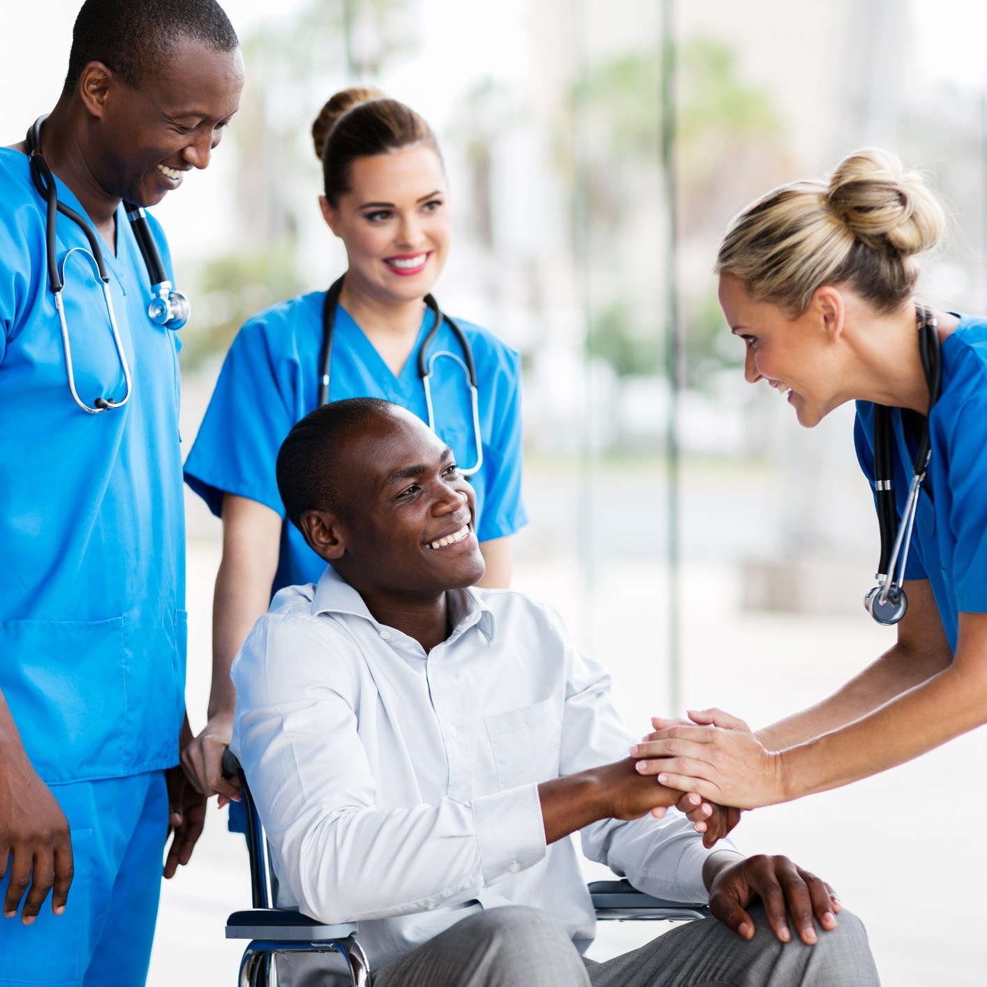 Happy staff greeting disabled patient. wecare@nationwidemedicalagency.com Tel: 715-864-0741, 920-249-7352, and 906-261-2325 410 W Franklin St # 2301APPLETON, WISCONSIN 54912-2301USA